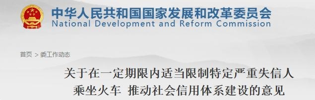 近日,国家发改委、民航局、铁路总公司等多部门联合发布相关意见,在一定期限内适当限制特定严重失信人乘坐民用航空器、火车,推动社会信用体系建设。意见自2018年5月1日起实施。